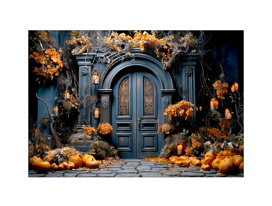 Fundo Fotográfico 2,20 x 1,50 - Halloween Cenário Porta Preta com Abóboras 059