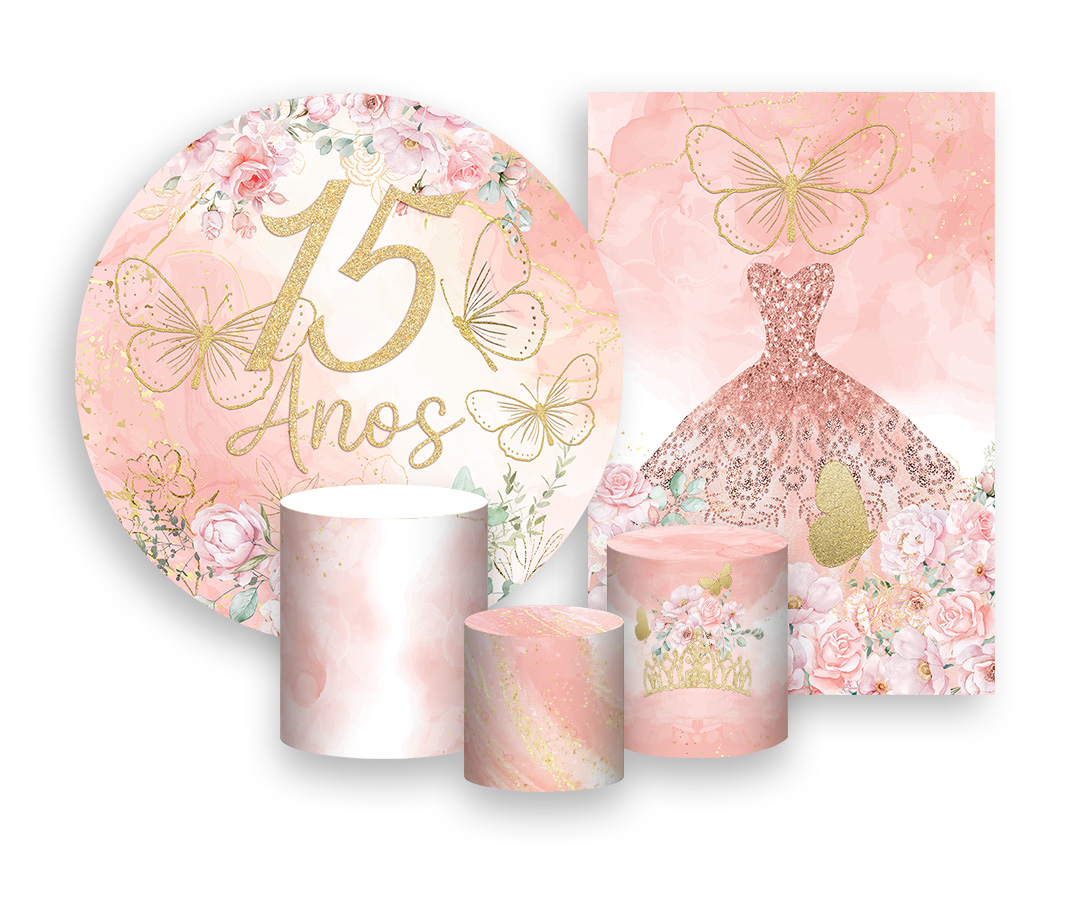 Kit 2 Painéis De Festa + Trio De Capas Cilindro - 15 Anos Rosa com Flores e Borboletas 091