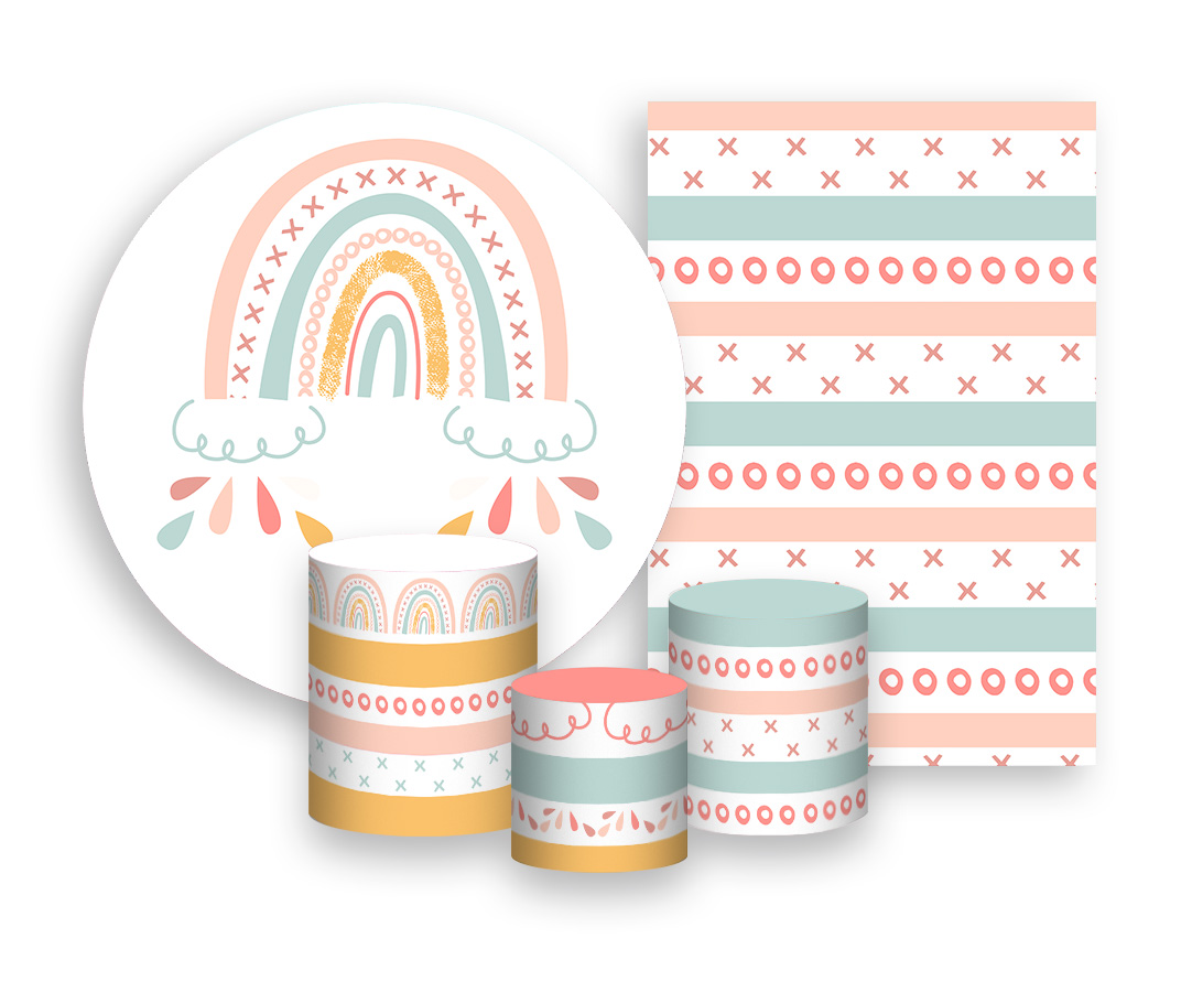 Kit 2 Painéis De Festa + Trio De Capas Cilindro - Arco-íris Boho Rosado 002