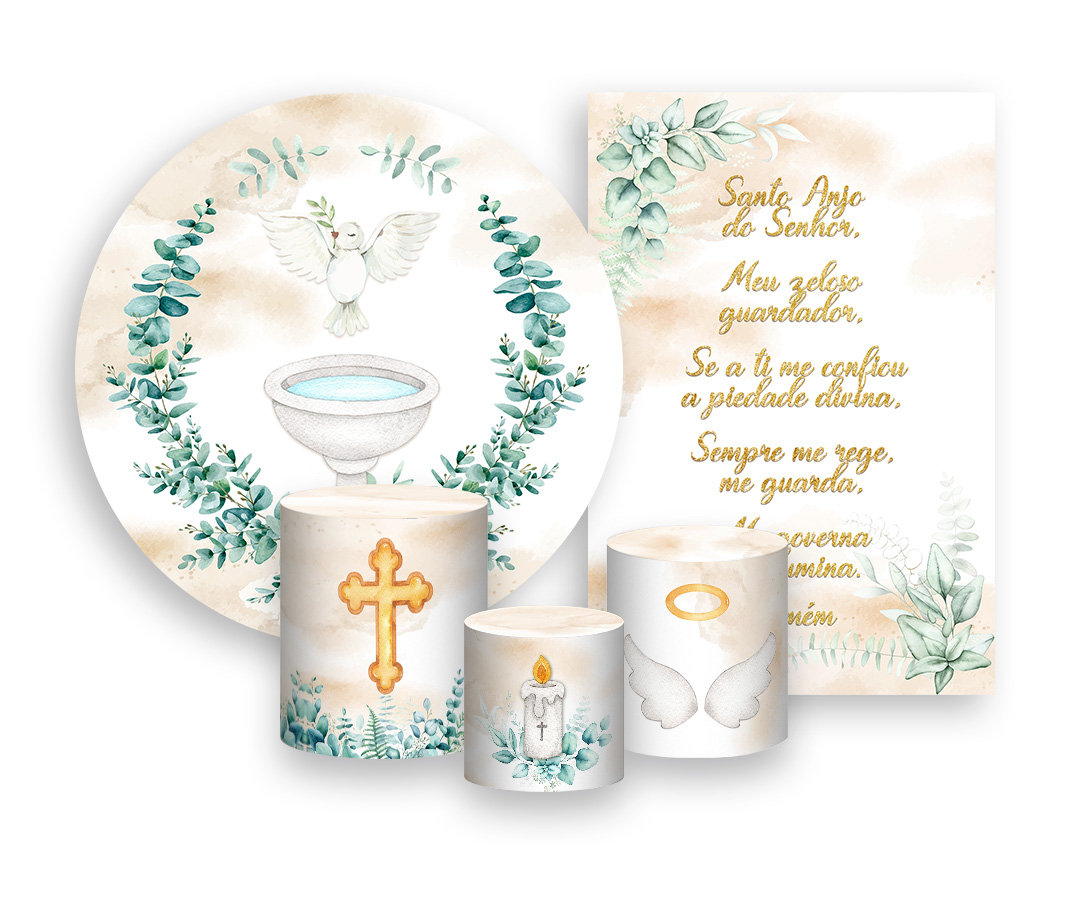 Kit 2 Painéis De Festa + Trio De Capas Cilindro - Batizado Folhagens Neutro 016