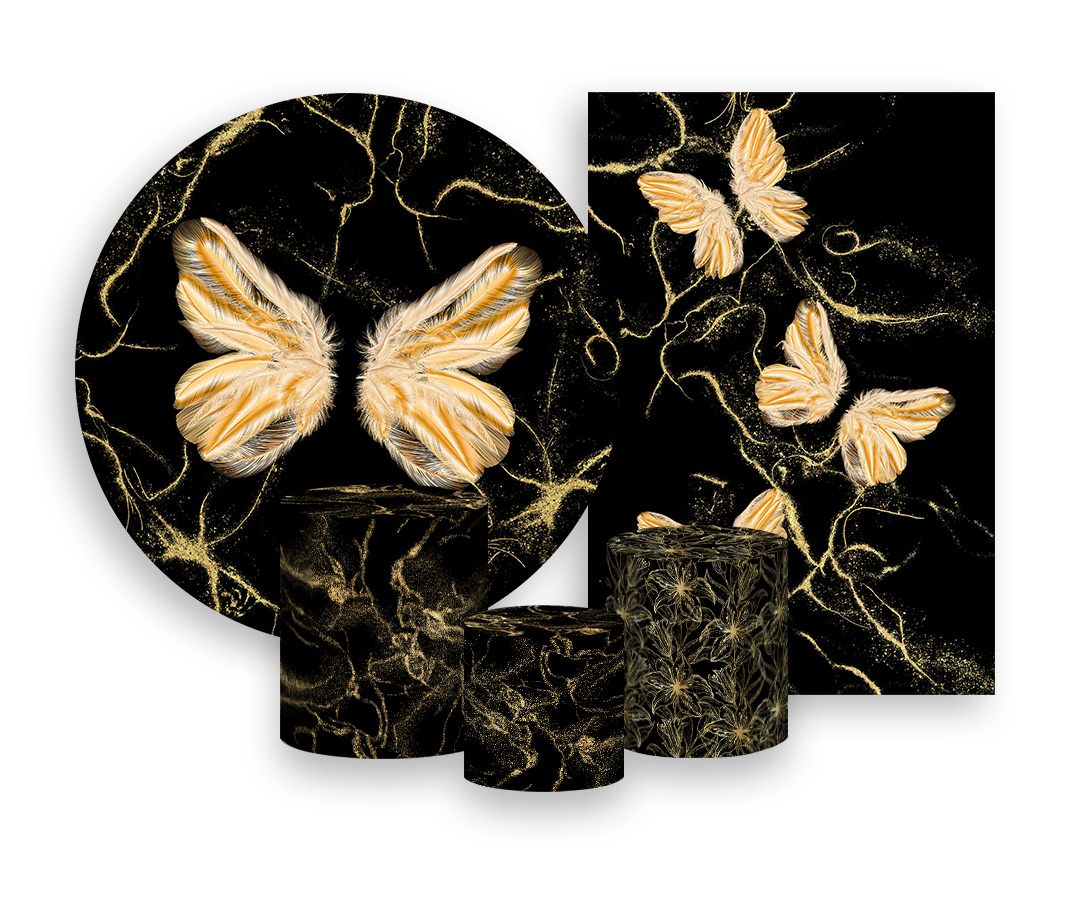 Kit 2 Painéis De Festa + Trio De Capas Cilindro - Borboletas Asas Douradas 005