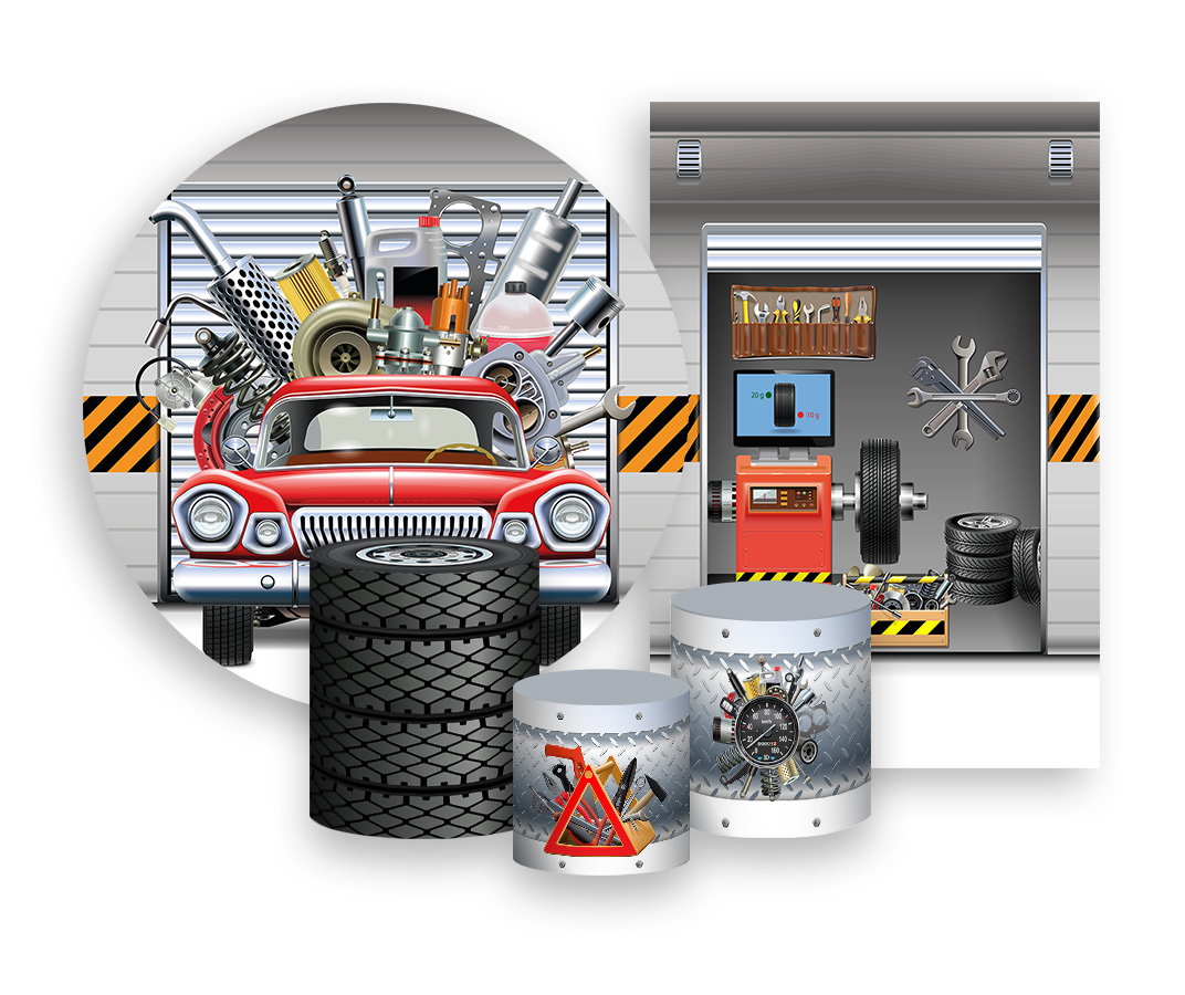 Kit 2 Painéis De Festa + Trio De Capas Cilindro - Carro na Oficina 004