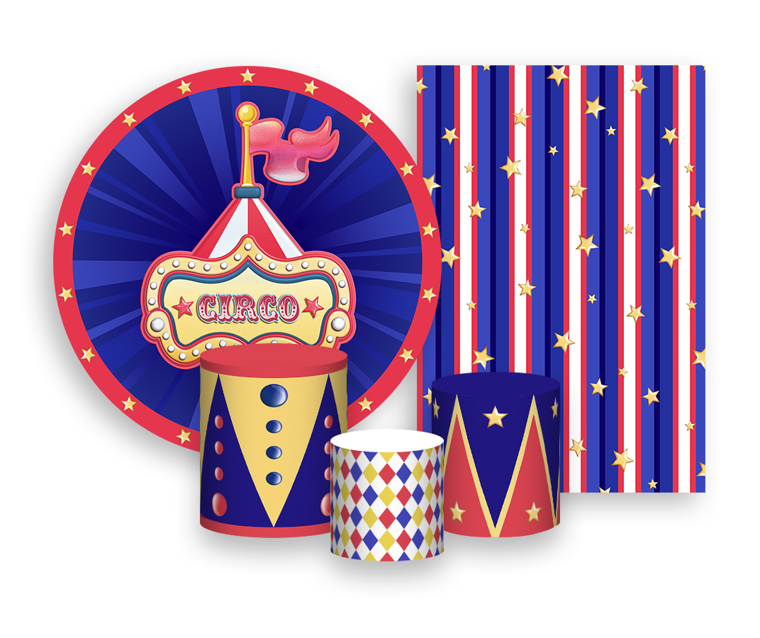Kit 2 Painéis De Festa + Trio De Capas Cilindro - Circo Tradicional Azul e Vermelho 022