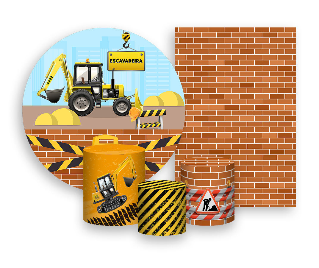 Kit 2 Painéis De Festa + Trio De Capas Cilindro - Construção Escavadeira 002