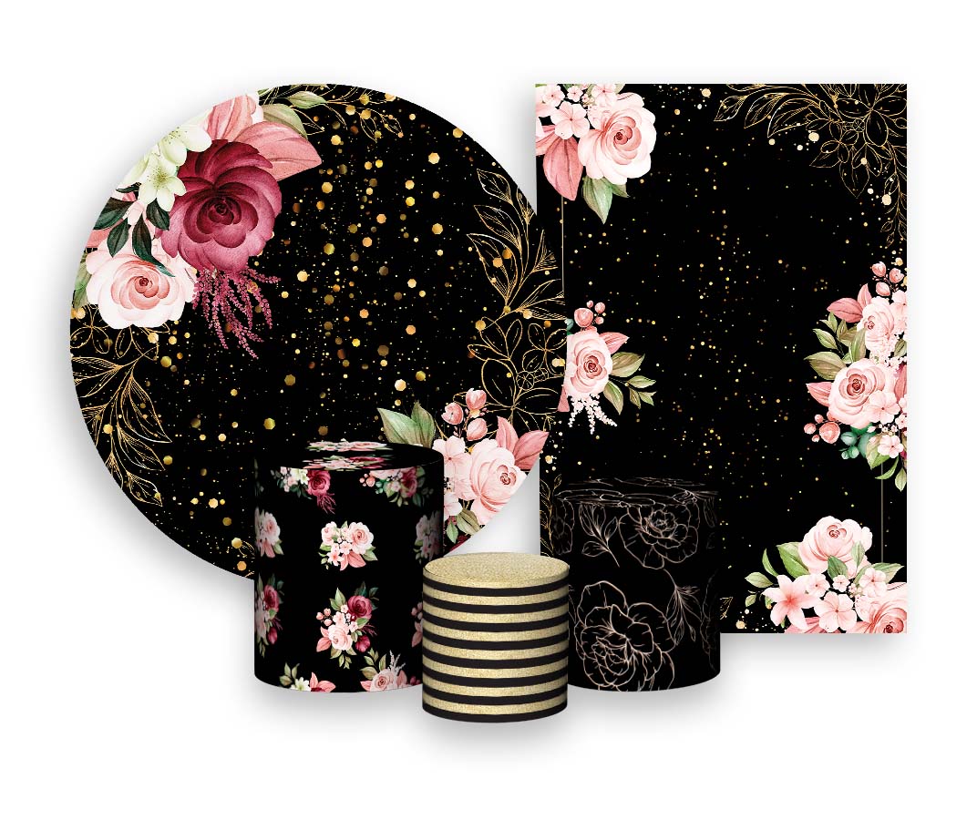 Kit 2 Painéis De Festa + Trio De Capas Cilindro - Flores Rosas Efeito Brilhos 010