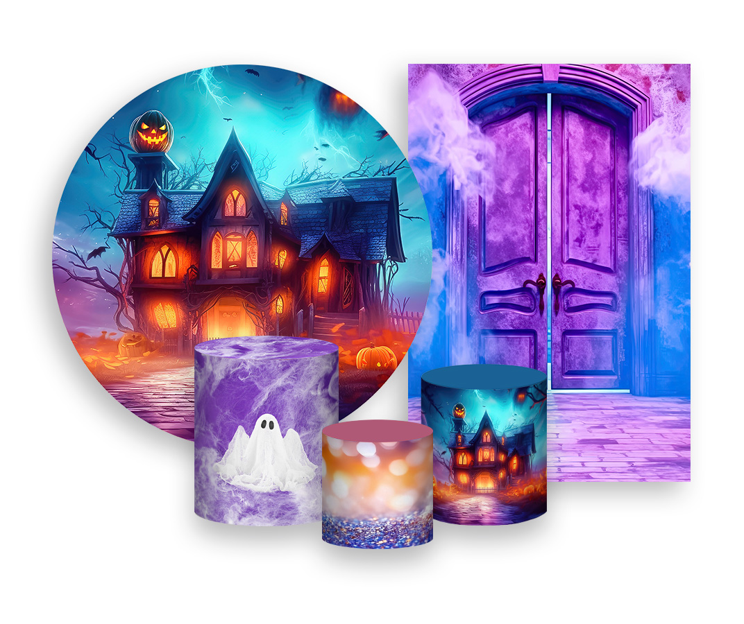 Kit 2 Painéis De Festa + Trio De Capas Cilindro - Halloween Realista Castelo 006