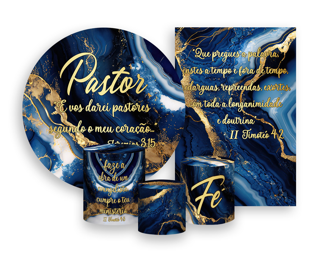 Kit 2 Painéis De Festa + Trio De Capas Cilindro - Pastor Efeito Marmorizado Azul com Dourado 015