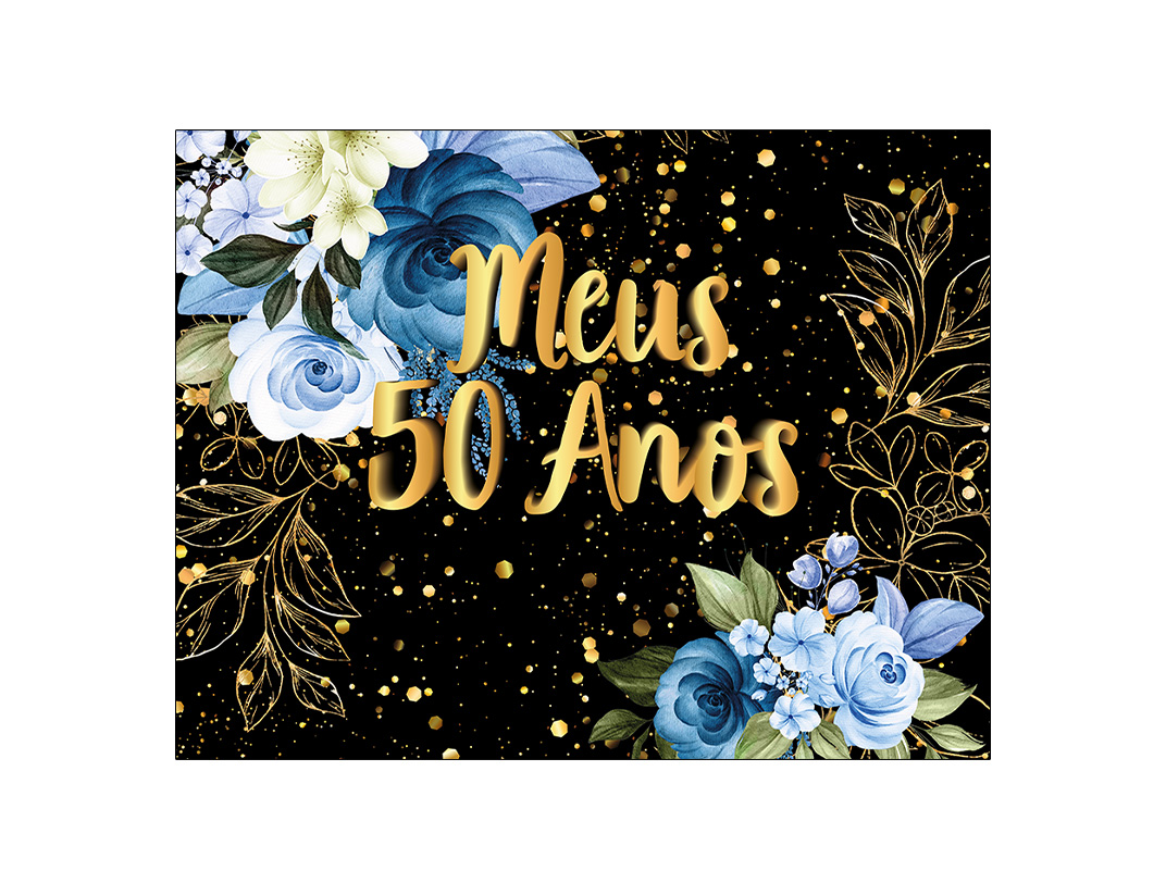 Painel de Festa Horizontal 1,55 X 1,20 - Flores Azuis Efeito Brilhos Meus 50 Anos 140