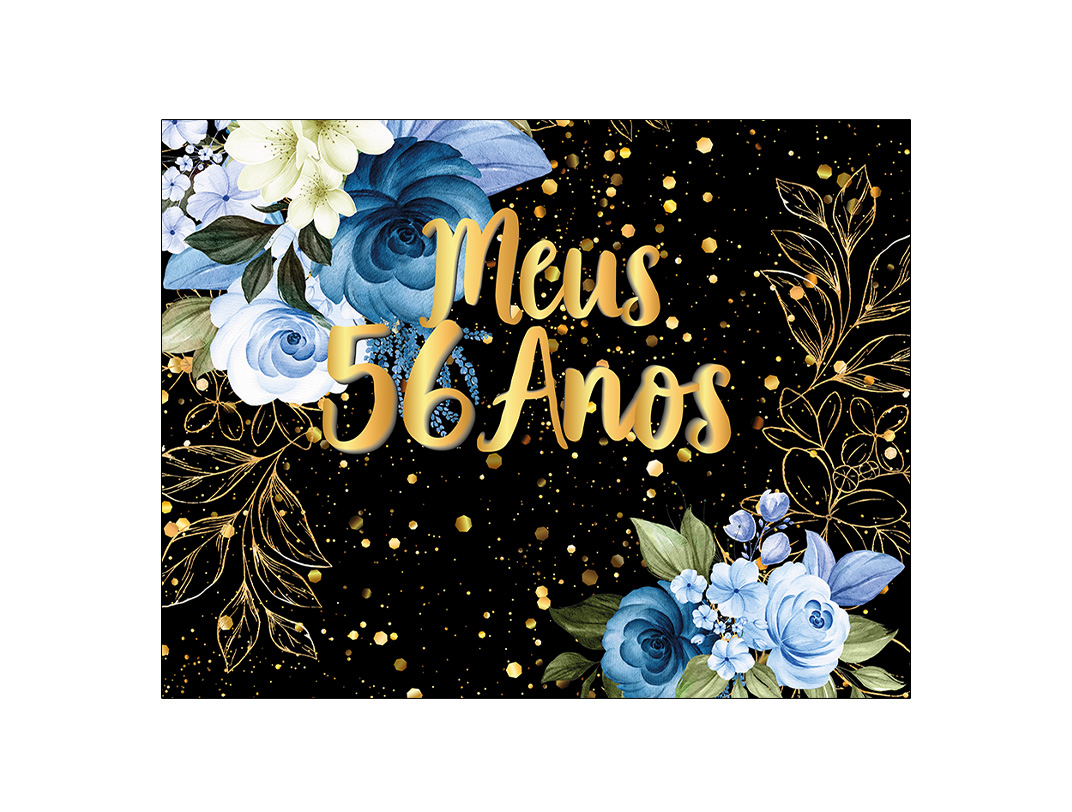 Painel de Festa Horizontal 1,55 X 1,20 - Flores Azuis Efeito Brilhos Meus 56 Anos 134