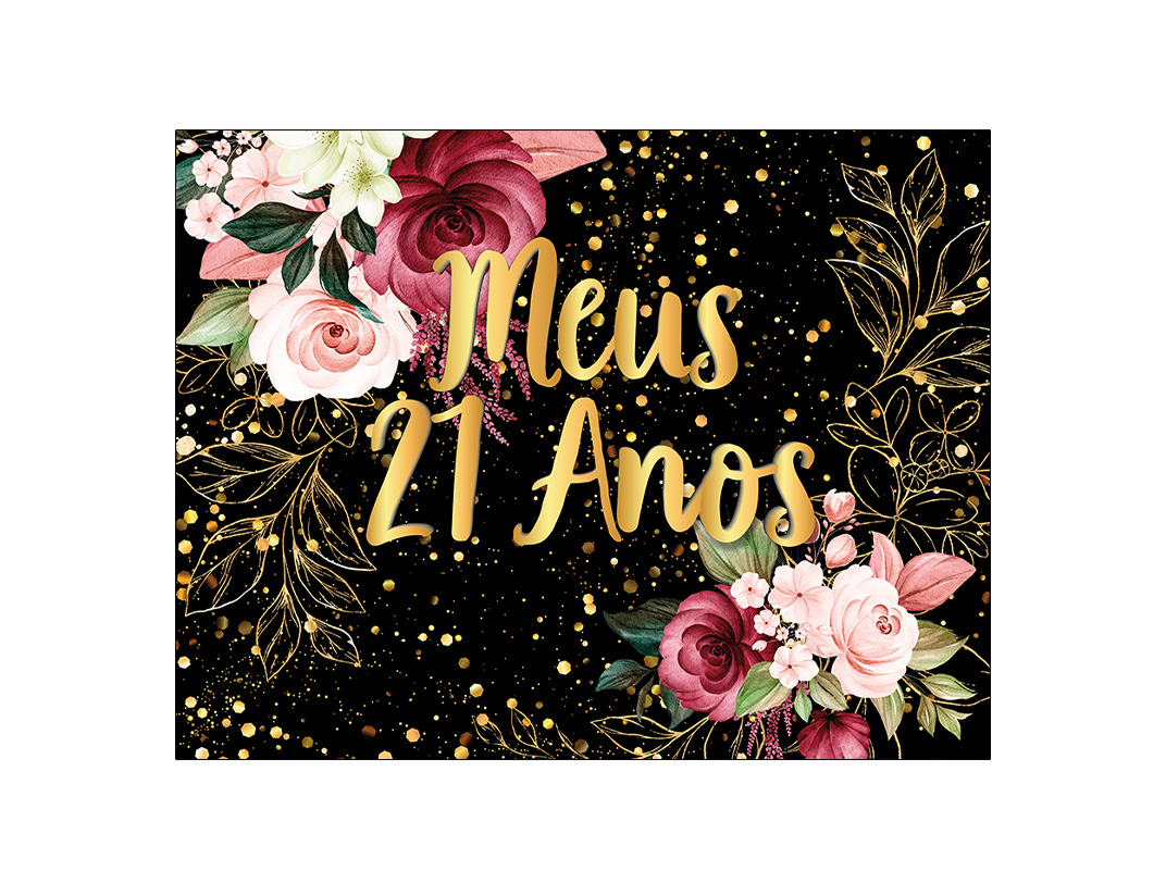 Painel de Festa Horizontal 1,55 X 1,20 - Flores Efeito Brilhos Meus 21 Anos Dourado 008
