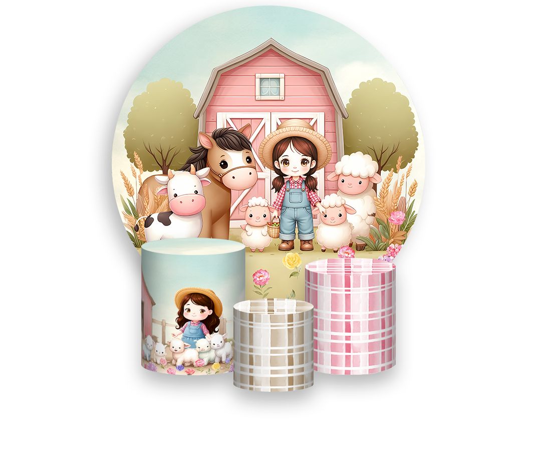 Painel De Festa Redondo 1,50 x 1,50 + Fazendinha Menina Morena Animais Fofos 040