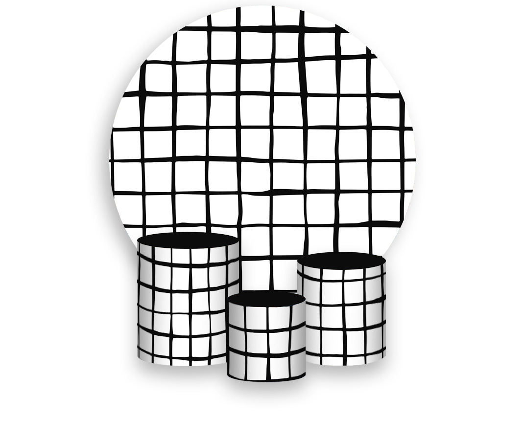 Painel De Festa Redondo 1,50 x 1,50 + Trio De Capas Cilindro - Estampa Grid Quadriculado Preto 046