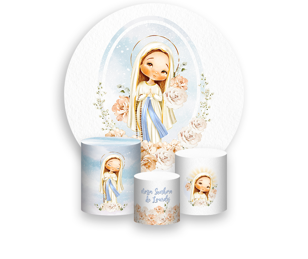 Painel De Festa Redondo 1,50 x 1,50 + Trio De Capas Cilindro - Nossa Senhora de Lourdes Branco Floral 022