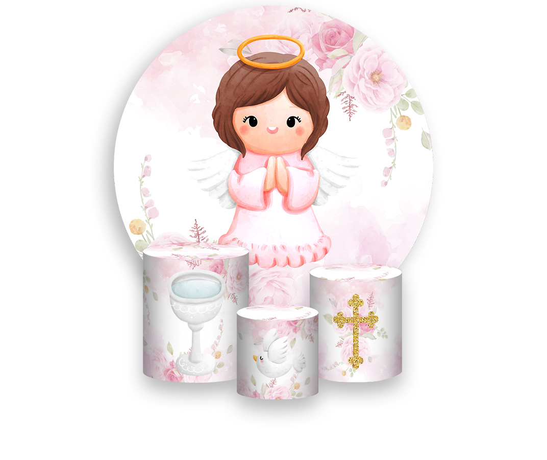 Painel De Festa Redondo 1,50 x 1,50 + Trio De Capas Cilindro - Anjinha Morena Flores Rosa 024