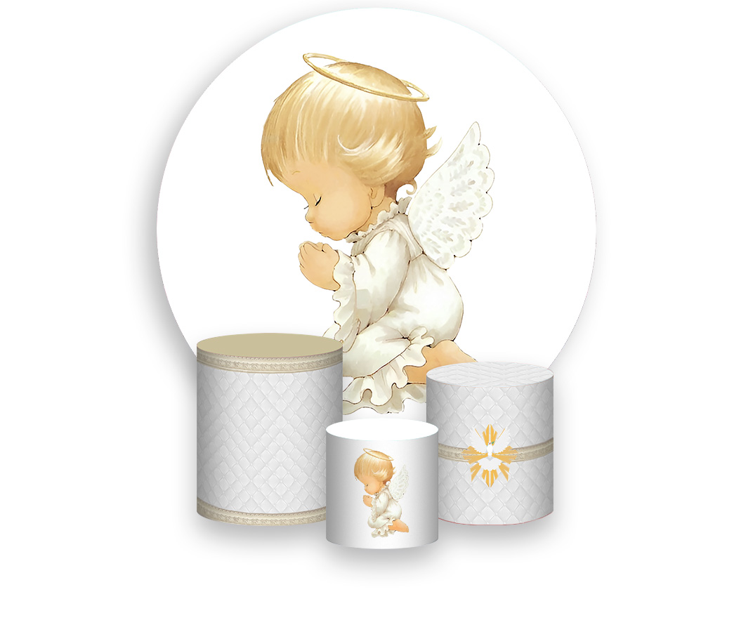 Painel De Festa Redondo 1,50 x 1,50 + Trio De Capas Cilindro - Anjinho Branco Loiro Batizado 005