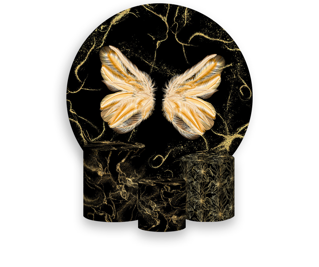 Painel De Festa Redondo 1,50 x 1,50 + Trio De Capas Cilindro - Borboleta Asas Douradas 008