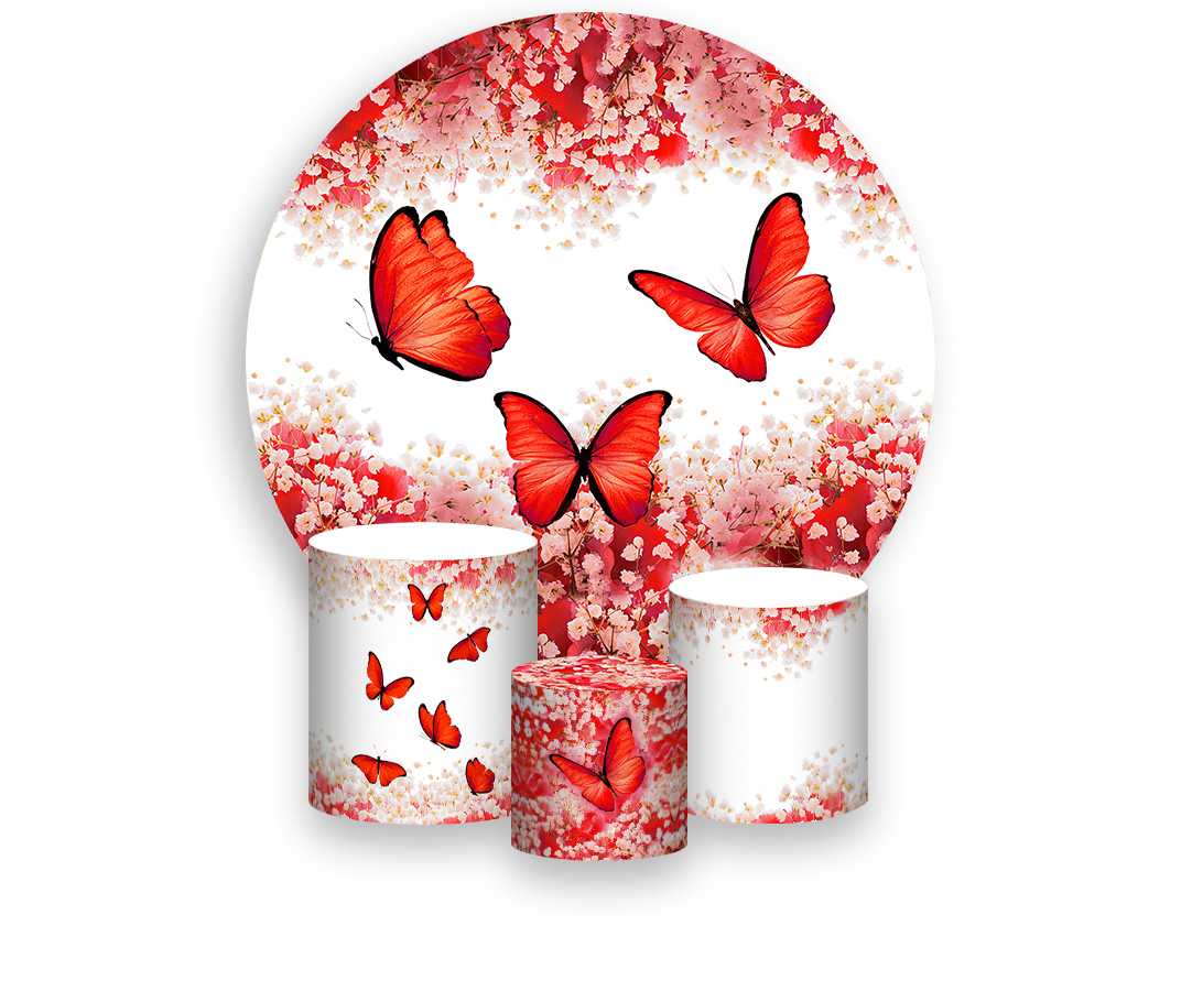 Painel De Festa Redondo 1,50 x 1,50 + Trio De Capas Cilindro - Borboleta Vermelha Floral 019