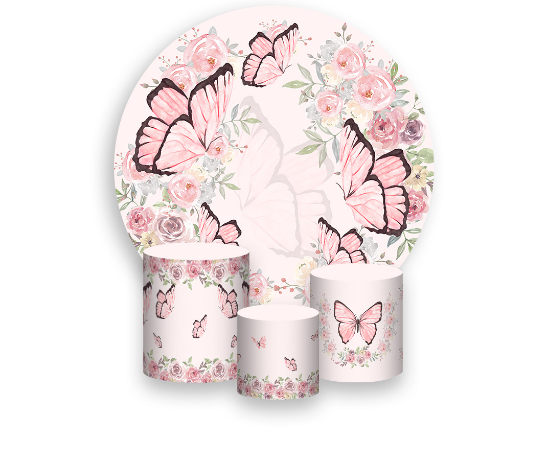 Painel De Festa Redondo 1,50 x 1,50 + Trio De Capas Cilindro - Borboletas Rose 014