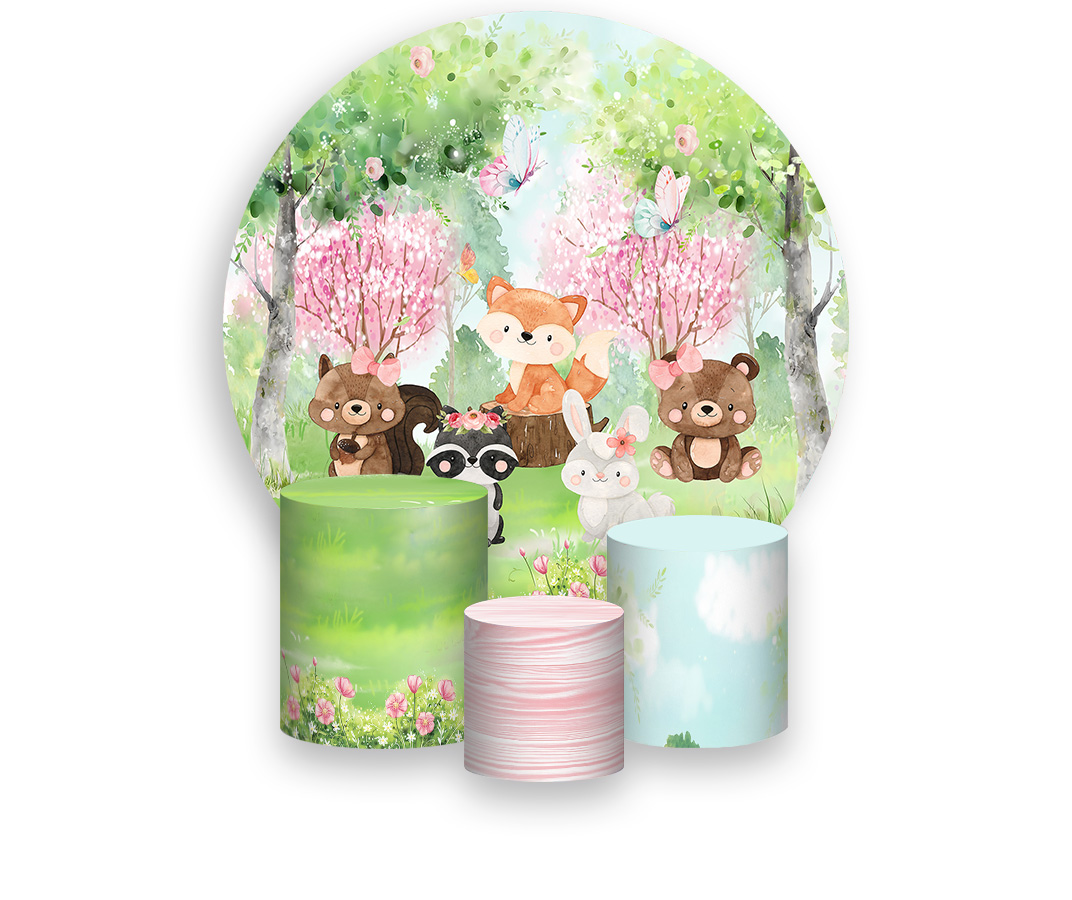 Painel De Festa Redondo 1,50 x 1,50 + Trio De Capas Cilindro - Bosque Animais Fofinhos 010