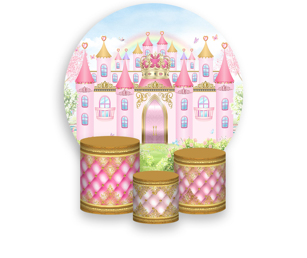 Painel De Festa Redondo 1,50 x 1,50 + Trio De Capas Cilindro - Castelo Jardim Rosa 005