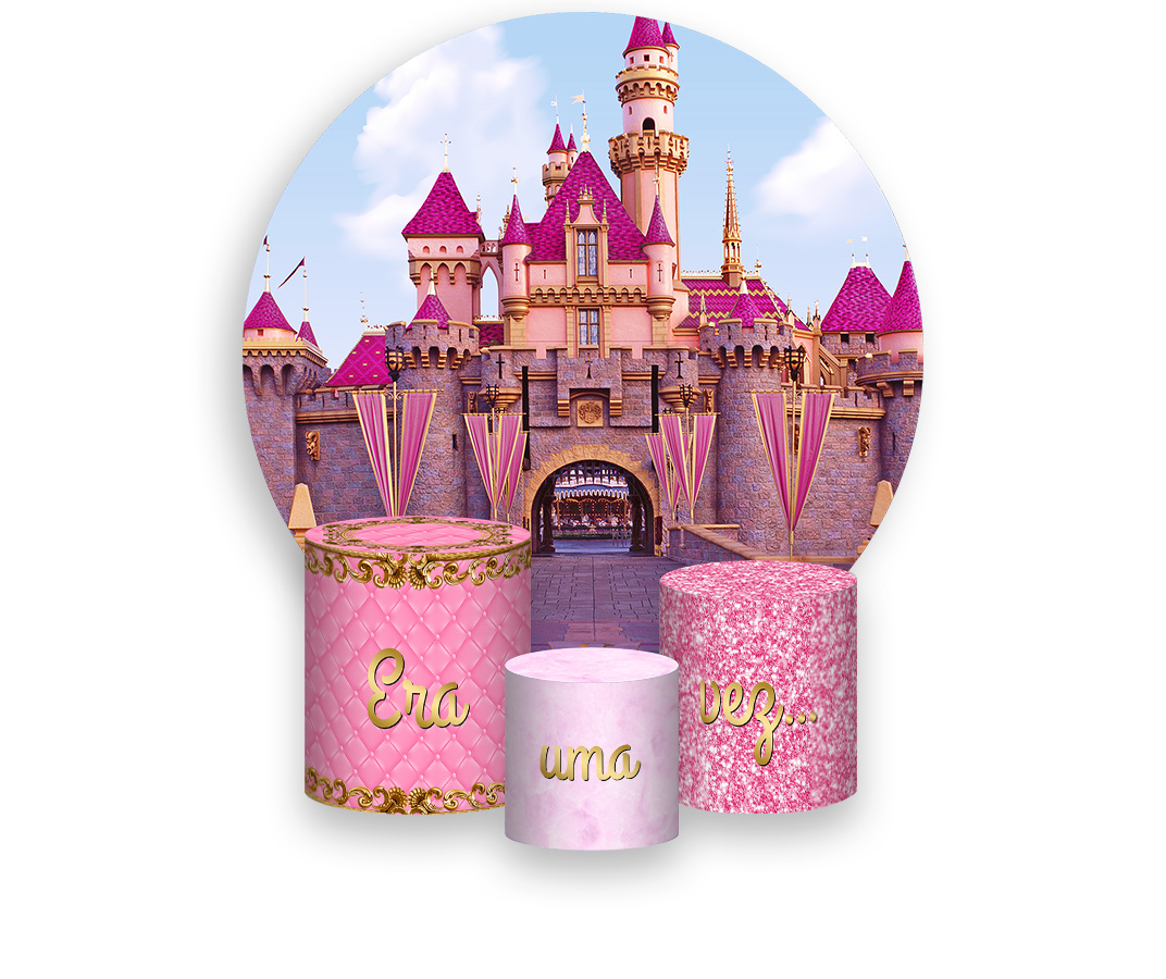 Painel De Festa Redondo 1,50 x 1,50 + Trio De Capas Cilindro - Castelo Rosa 002