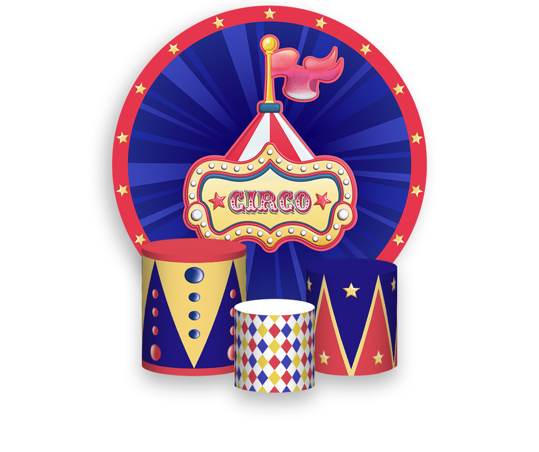 Painel De Festa Redondo 1,50 x 1,50 + Trio De Capas Cilindro - Circo Azul e Vermelho Tradicional 025