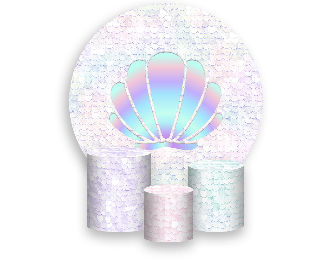 Painel De Festa Redondo 1,50 x 1,50 + Trio De Capas Cilindro - Escamas de Sereia e Concha 012