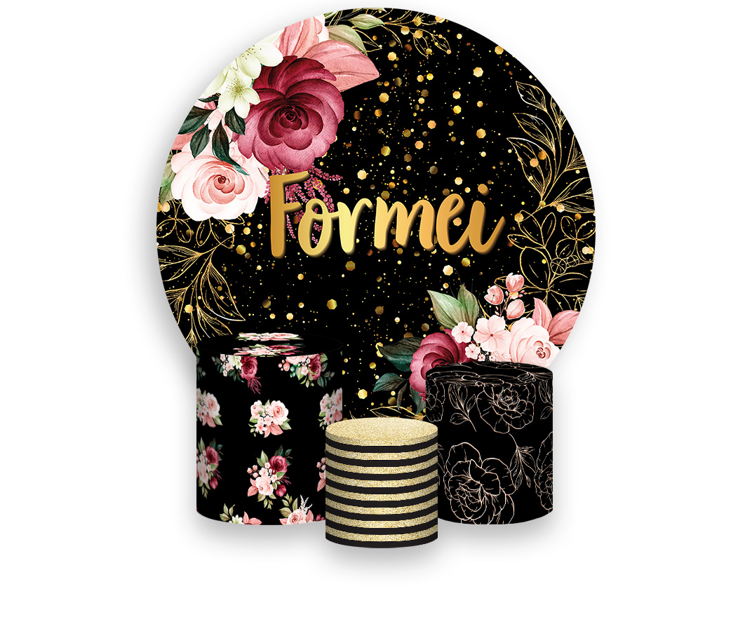 Painel De Festa Redondo 1,50 x 1,50 + Trio De Capas Cilindro - Flores Efeito Brilhos Formatura 008