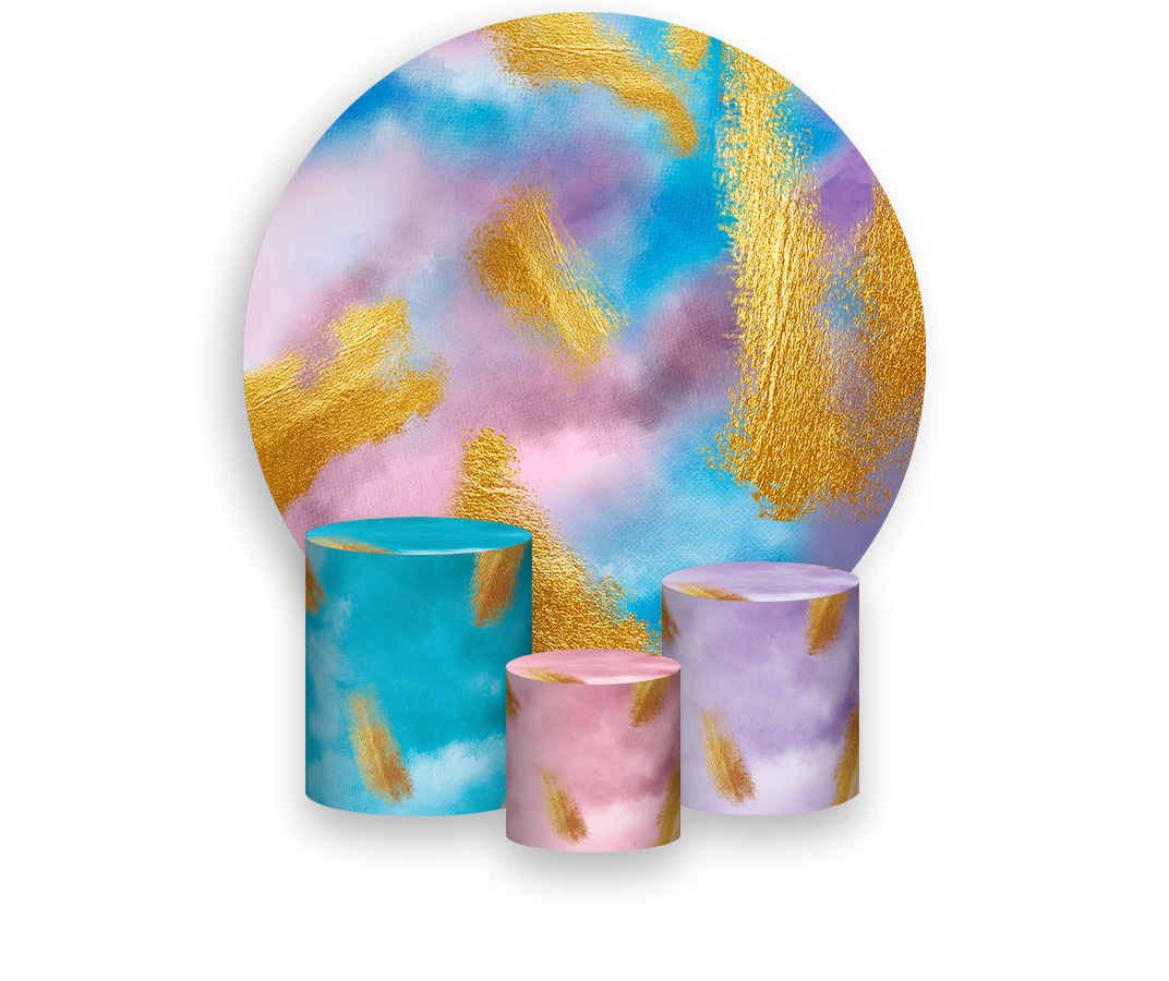 Painel De Festa Redondo 1,50 x 1,50 + Trio De Capas Cilindro - Tie Dye com Dourado 007