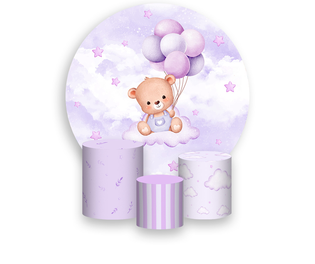 Painel De Festa Redondo 1,50 x 1,50 + Trio De Capas Cilindro - Ursinha de Pelúcia Lilás 079