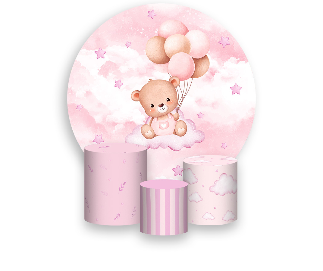 Painel De Festa Redondo 1,50 x 1,50 + Trio De Capas Cilindro - Ursinha de Pelúcia Rosa 080