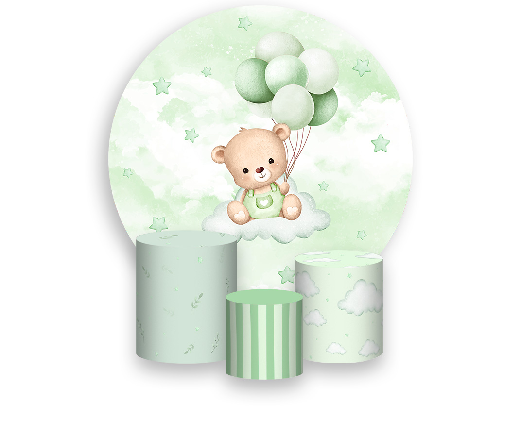 Painel De Festa Redondo 1,50 x 1,50 + Trio De Capas Cilindro - Ursinha de Pelúcia Verde 081