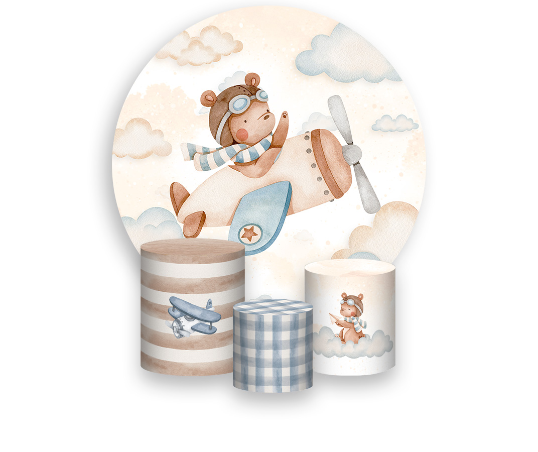 Painel De Festa Redondo 1,50 x 1,50 + Trio De Capas Cilindro - Urso Aviador nas Nuvens 076