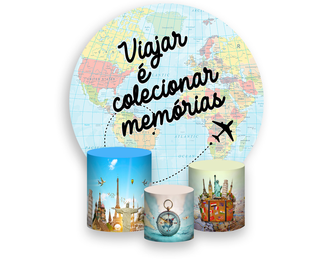 Painel De Festa Redondo 1,50 x 1,50 + Trio De Capas Cilindro - Volta ao Mundo Viajar 010