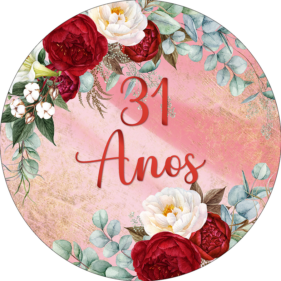 Painel De Festa Redondo 1,50x1,50 - 31 Anos Efeito Mármore com Flores 258