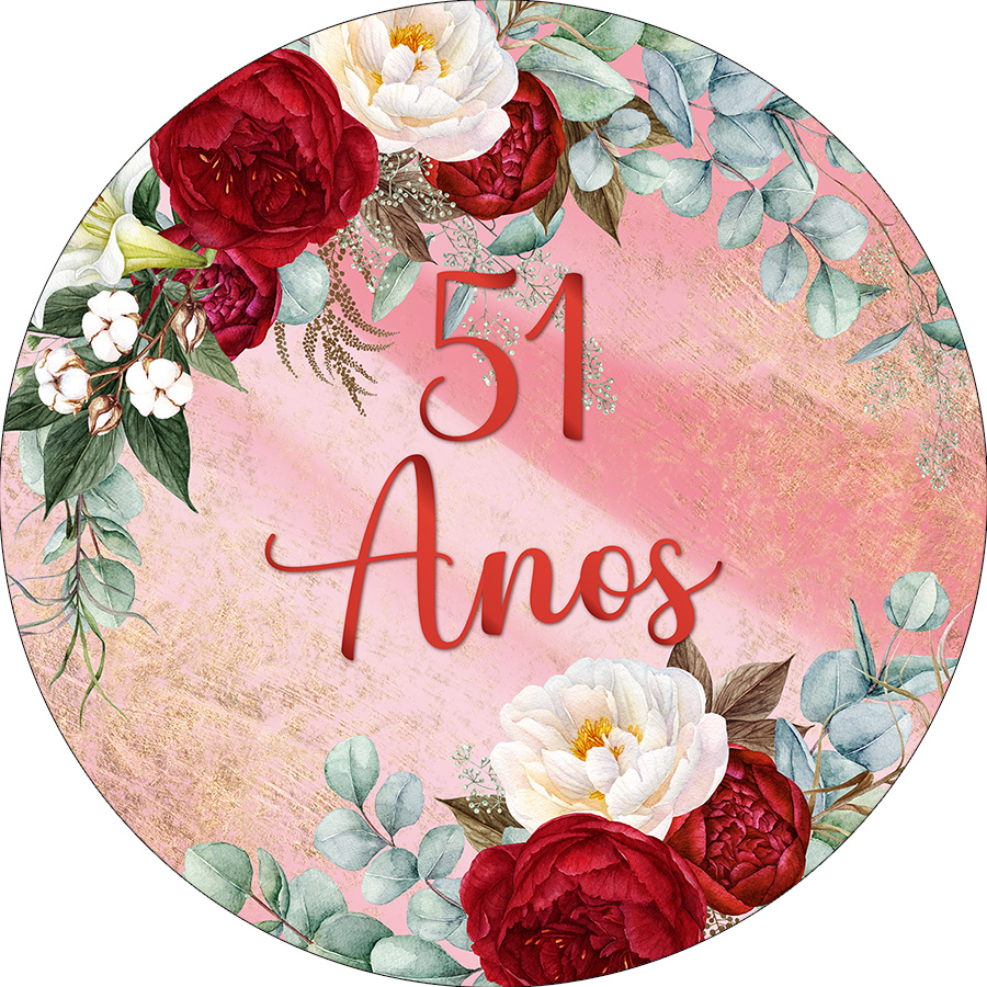 Painel De Festa Redondo 1,50x1,50 - 51 Anos Efeito Mármore com Flores 248