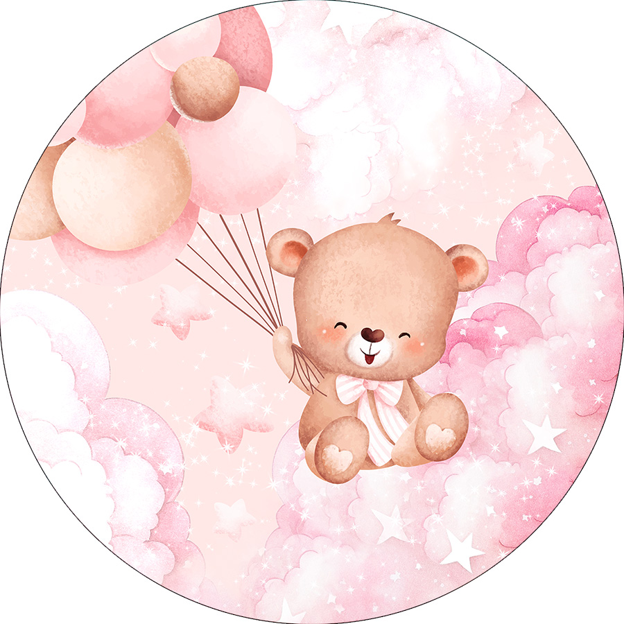 Painel De Festa Redondo 1,50x1,50 - Chá de Bebê Ursinho Voando Céu Rosa 056