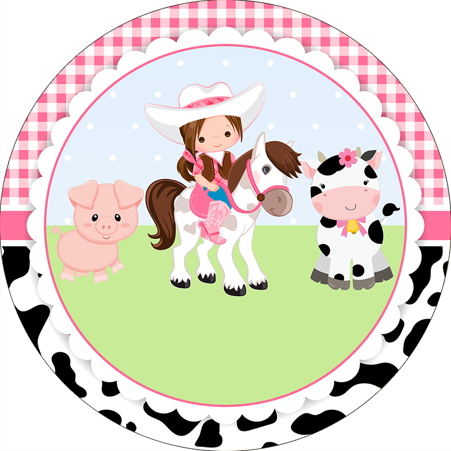 Painel De Festa Redondo 1,50x1,50 - Fazendinha Vaqueira Rosa 036