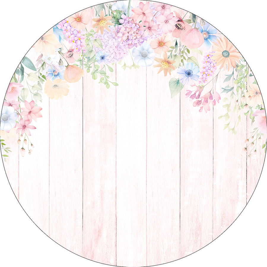Painel De Festa Redondo 1,50x1,50 - Flores Fundo Efeito Madeira 050