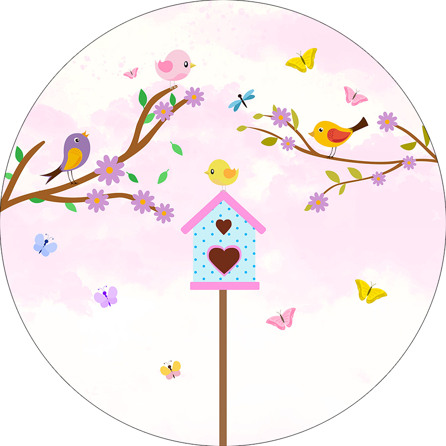 Painel De Festa Redondo 1,50x1,50 - Jardim Passáros Rosa Suave 015