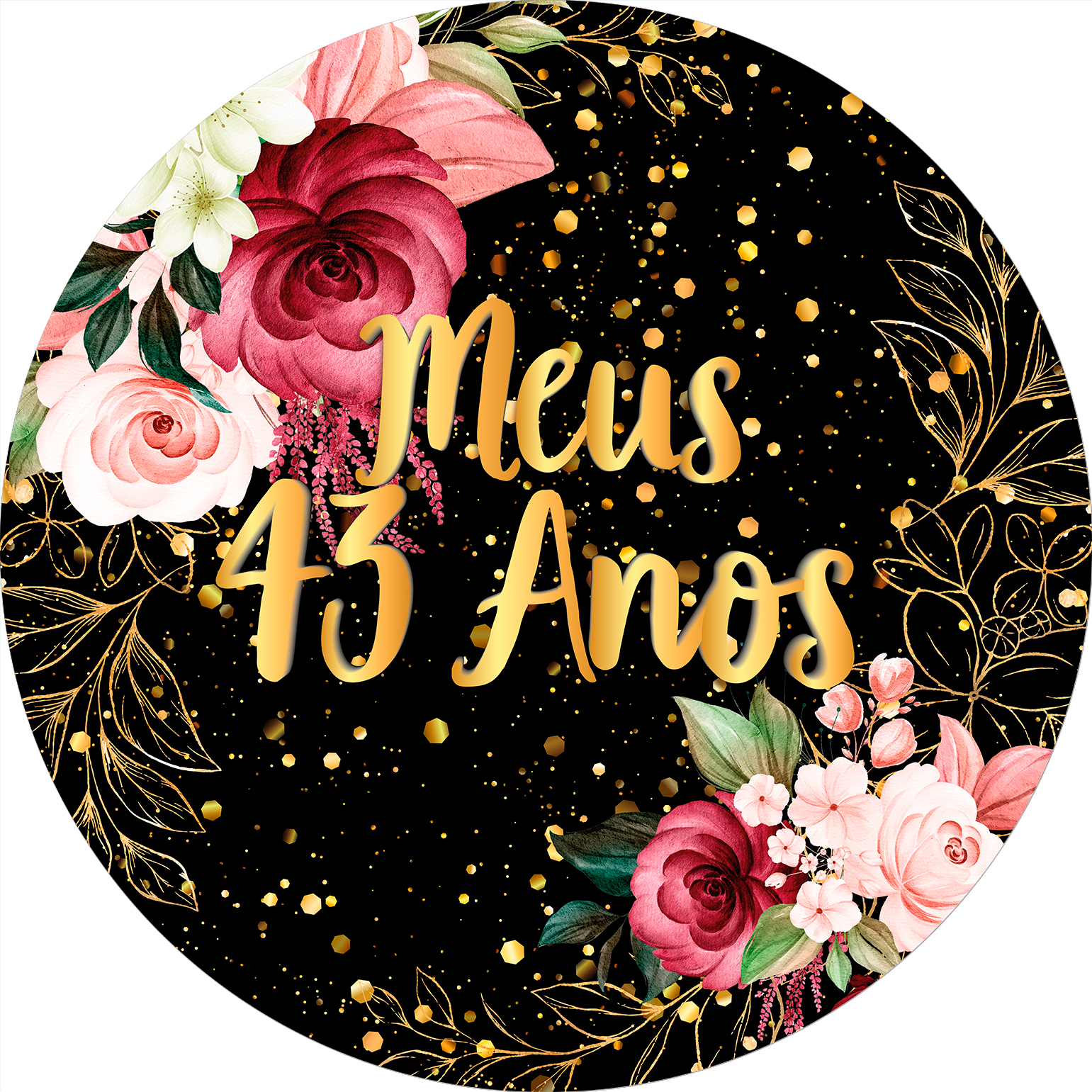 Painel De Festa Redondo 1,50x1,50 - Meus 43 Anos Dourado Floral 079