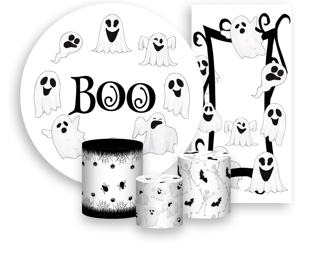 Painel De Festa + Trio De Capas Cilindro + Faixa Veste Fácil -  Halloween Fantasminhas 013