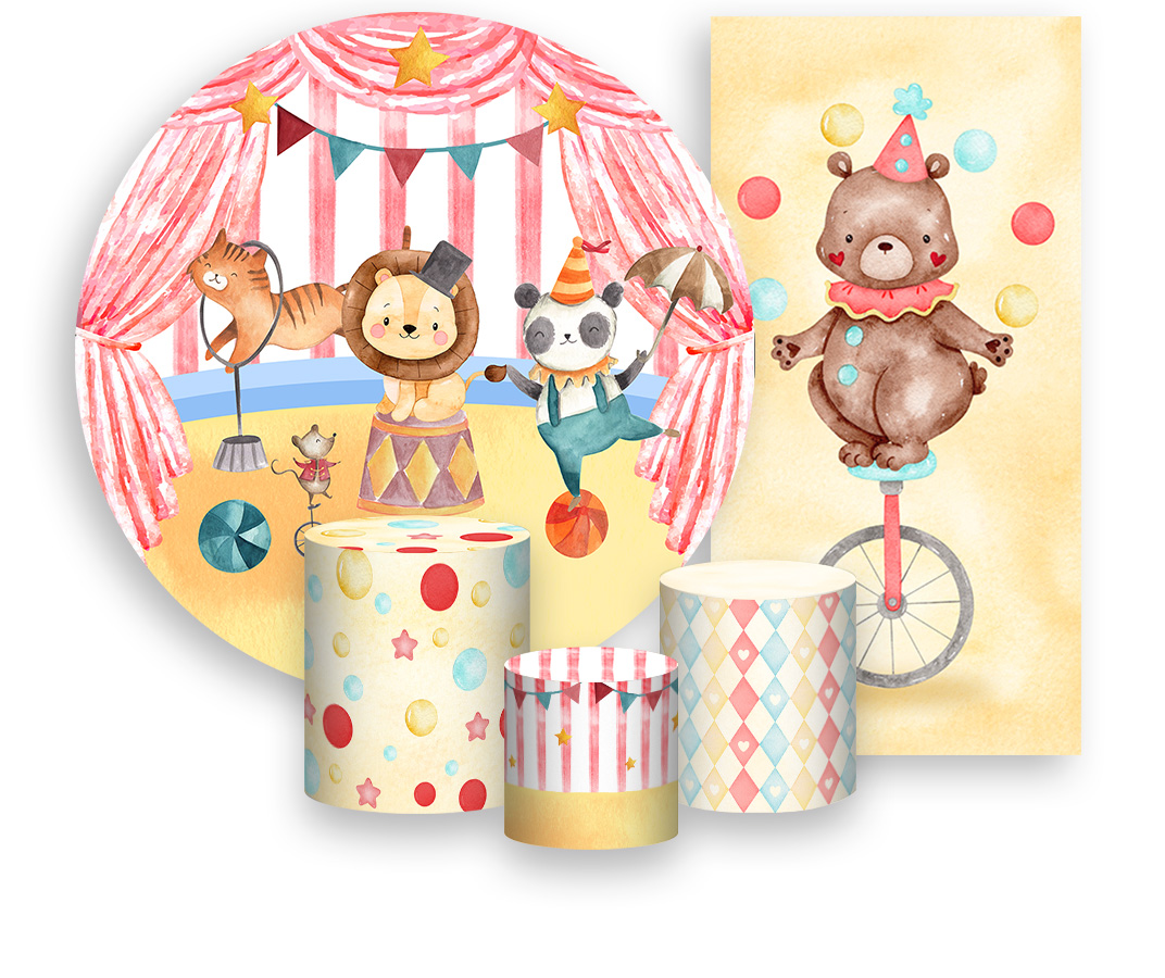 Painel De Festa + Trio De Capas Cilindro + Faixa Veste Fácil - Animais Circo Vermelho e Amarelo 006