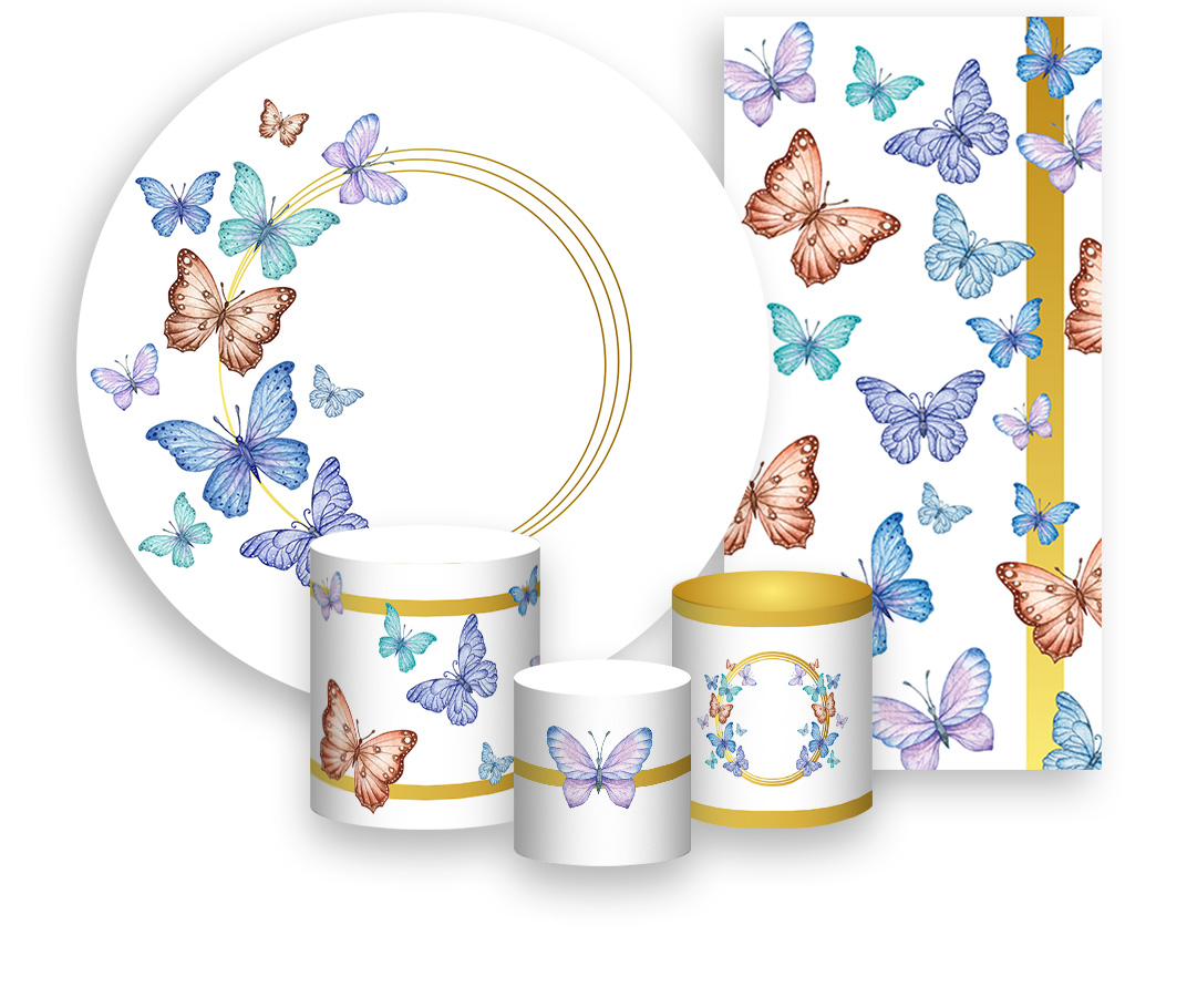 Painel De Festa + Trio De Capas Cilindro + Faixa Veste Fácil - Borboleta Efeito Glitter Dourado 008