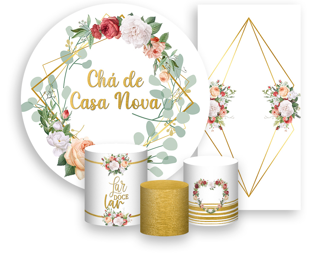Painel De Festa + Trio De Capas Cilindro + Faixa Veste Fácil - Chá de Casa Nova Flores Dourado 001