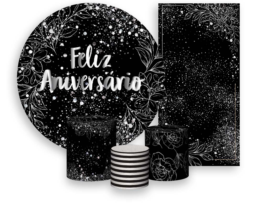 Painel De Festa + Trio De Capas Cilindro + Faixa Veste Fácil - Efeito Brilhos Feliz Aniversário Prateado 051