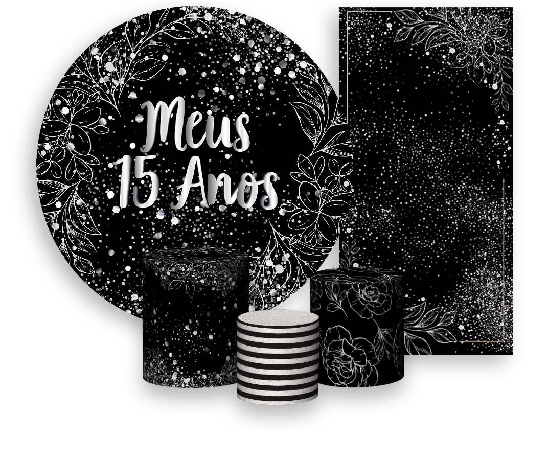 Painel De Festa + Trio De Capas Cilindro + Faixa Veste Fácil - Efeito Brilhos Meus 15 Anos Prateado 044