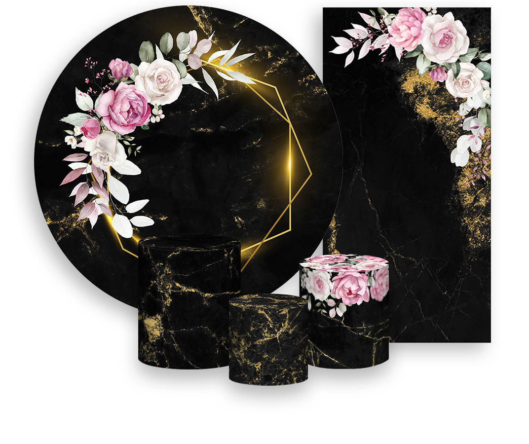 Painel De Festa + Trio De Capas Cilindro + Faixa Veste Fácil - Efeito Geométrico Floral Preto e Dourado 025