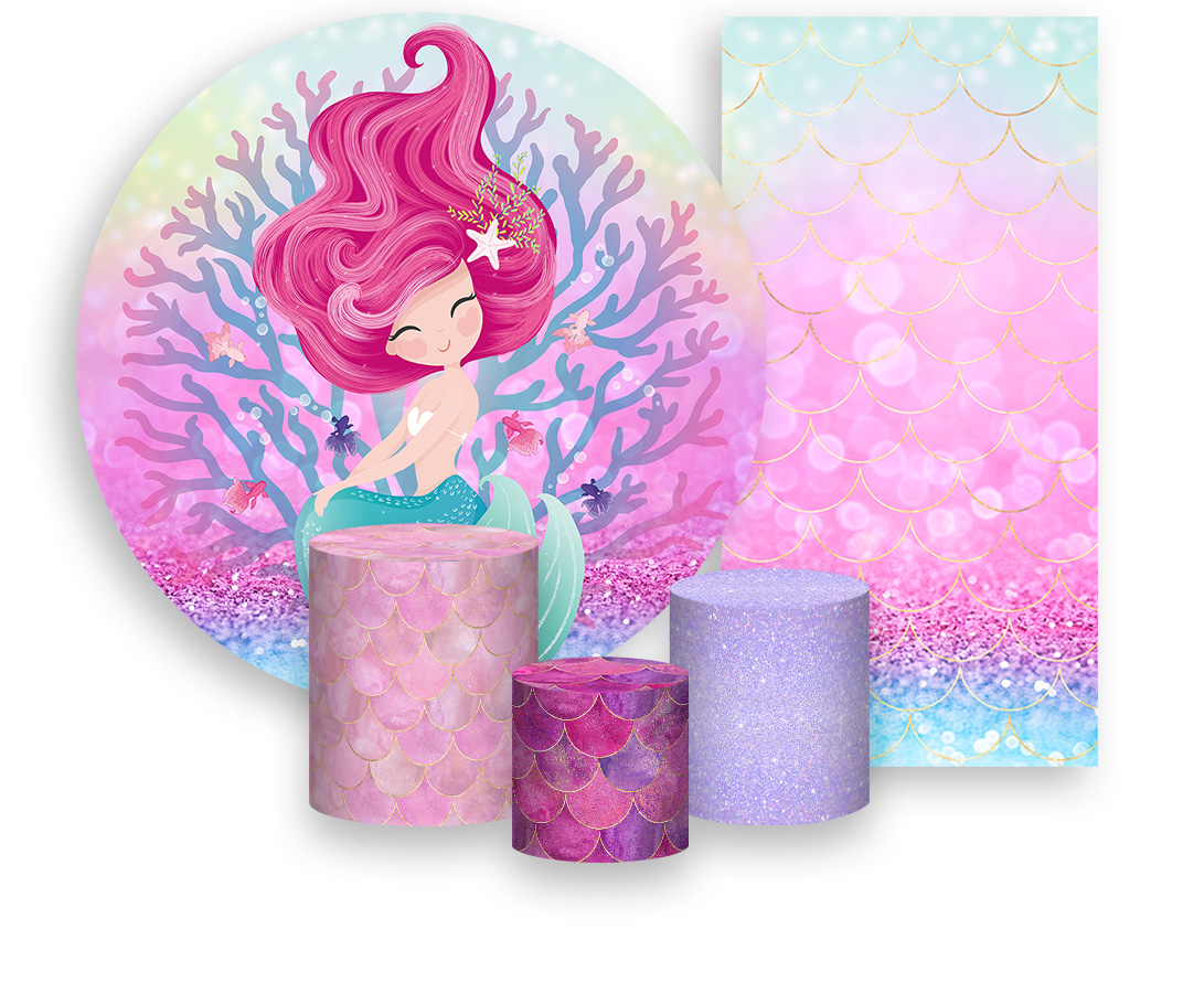 Painel De Festa + Trio De Capas Cilindro + Faixa Veste Fácil - Efeito Glitter Sereia Rosa 002