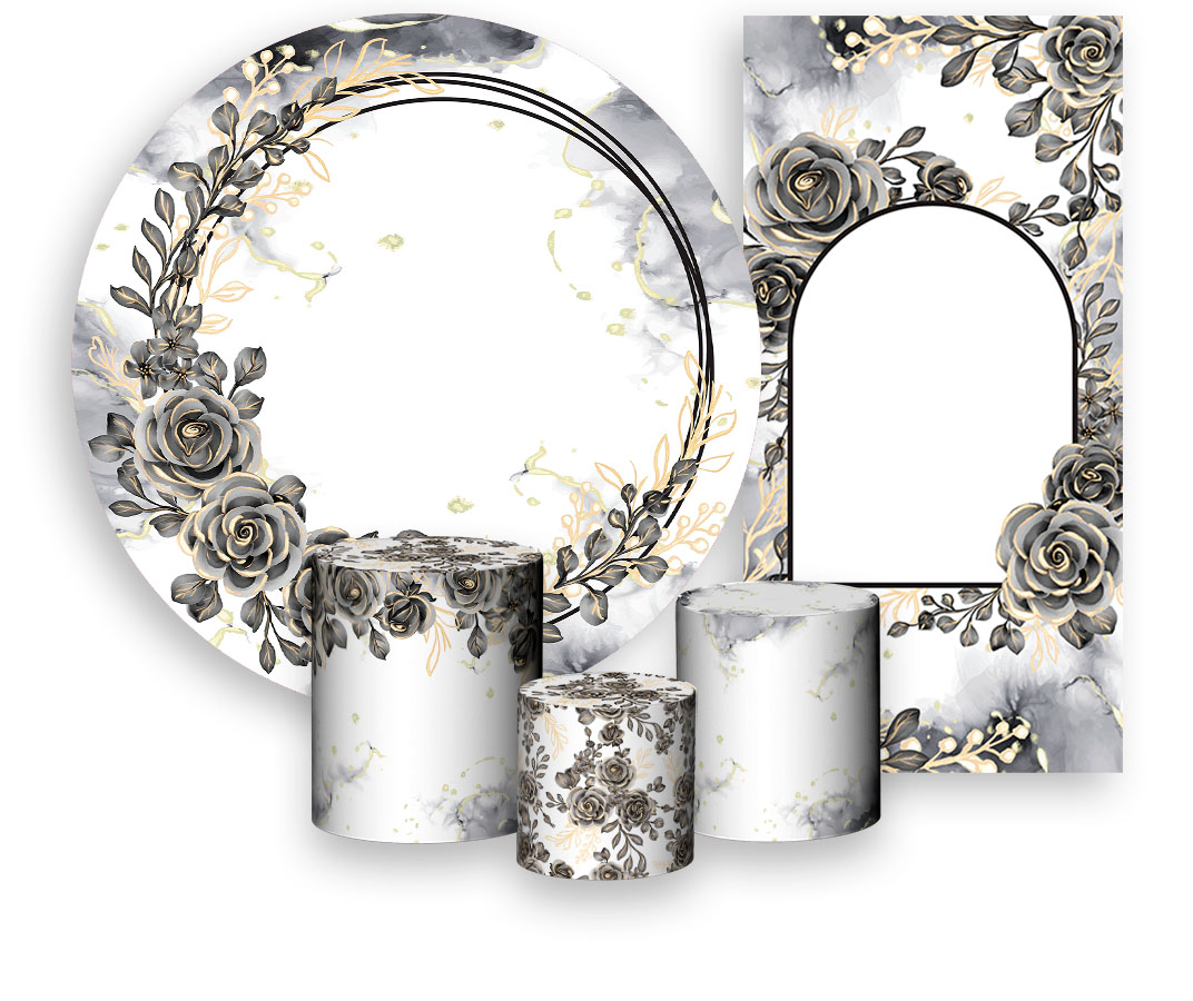 Painel De Festa + Trio De Capas Cilindro + Faixa Veste Fácil - Efeito Marmorizado Preto com Flores 003